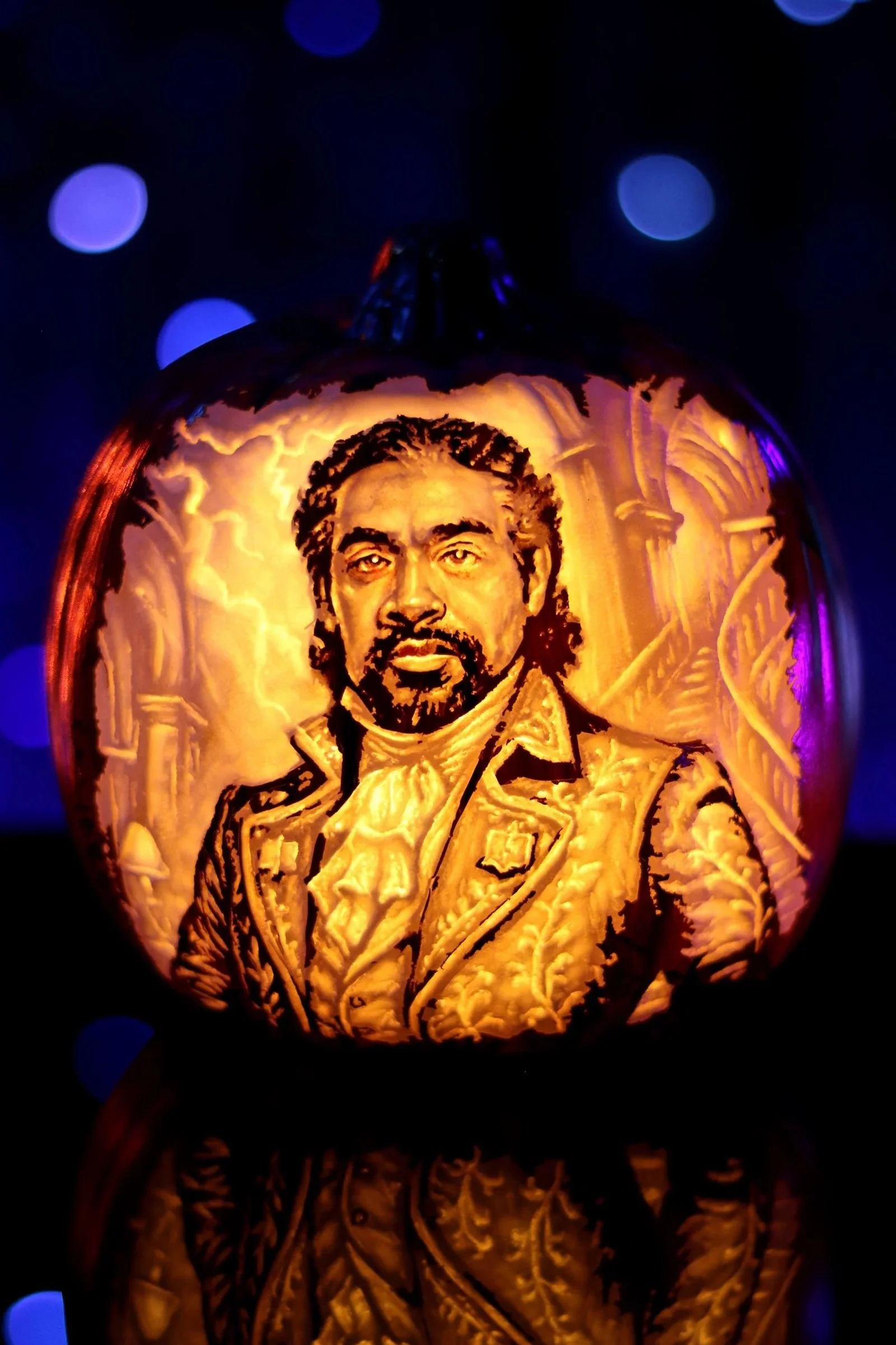 Halloween season is my favorite time of year. As long as I can remember I have spent countless hours dreaming up, designing, and carving elaborate pumpkin portraiture. Despite all my time and effort, all my work would simply rot away each passing season. However, thanks to advancements in the Halloween Sciences, craft foam pumpkins became a thing! Because they never rot my portrait pumpkin artwork can be displayed year round. Each pumpkin can be lit safely with Low Voltage LED lighting. Although I mostly carve on specially modified Funkins and other faux pumpkins I still carve organic pumpkins when in season.